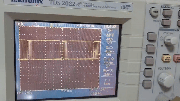 Duty Cycle=0 이면 0신호가 나타날테고, Duty Cycle=100%이면 1신호가 나타날 것이다. 그래서, 파형의 주파수가 지나치게 낮지 않은 이상, 즉 10Hz 이하가 아니라면, 파형의 주파수는 큰 의미가 없다.