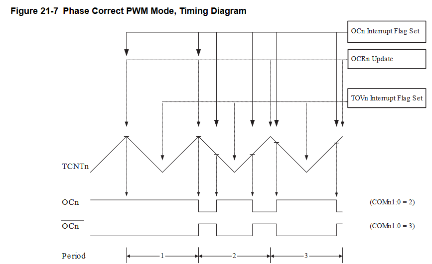 PWM에서는 TCNT 값이 한 사이클 돌 때마다, OCR 값을 만나면 신호가 반전된다.