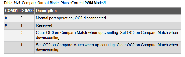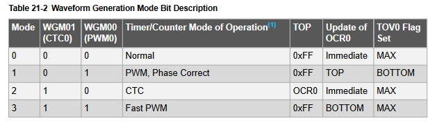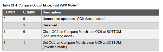 TCCR0 = 0b01101010; // Fast PWM, Non-inverting, 8 prescaler