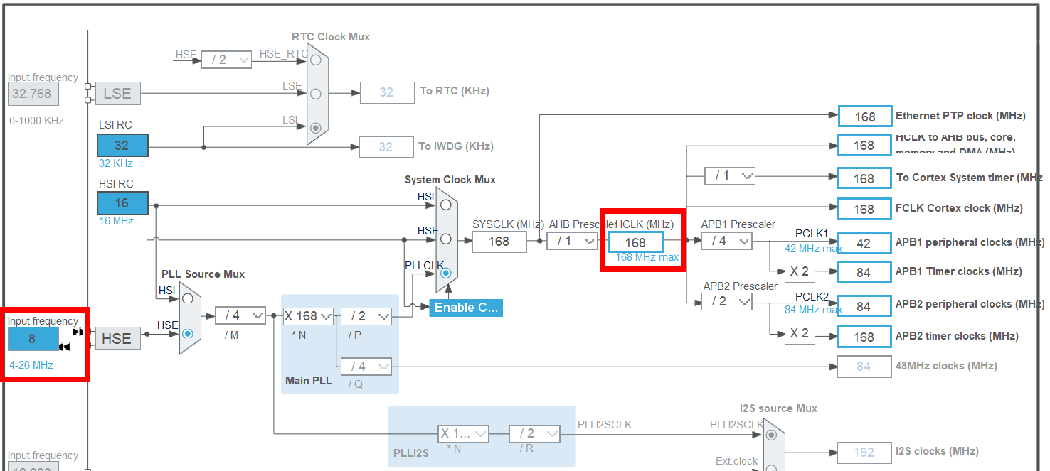 HSE는 High Speed External을 뜻하며, 외부에서 공급하는 고속의 클럭 소스를 의미합니다. 즉, 외부 크리스탈/오실레이터를 의미합니다.