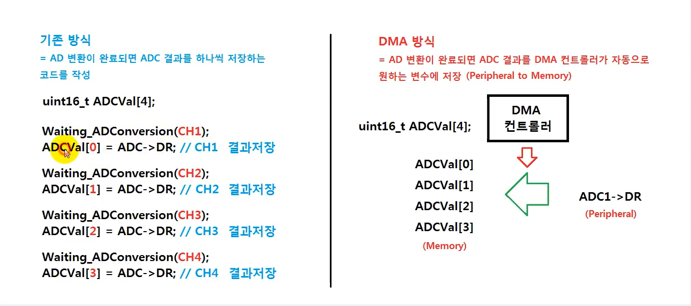 강의에서는, ADC1만 사용하므로 peripheral에는 주소를 증가하면 안되므로 체크하면 안되고,